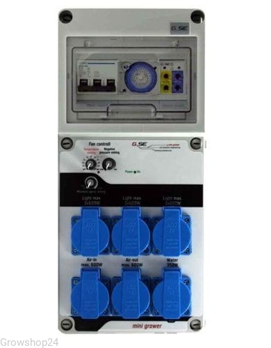 Mini Grower to kompletny sterownik do wewnętrznych systemów uprawy ze sztucznym oświetleniem. Określa interwał oświetlenia dla świateł 9X600W, określa interwał nawadniania przez zegar GSE wody i reguluje klimat przez temperaturę GSE i kontroler wentylatora ciśnienia ujemnego. Wszystkie sterowniki są umieszczone na tablicy z klapą i mogą być sterowane przez główny wyłącznik bezpieczeństwa 3x16A.